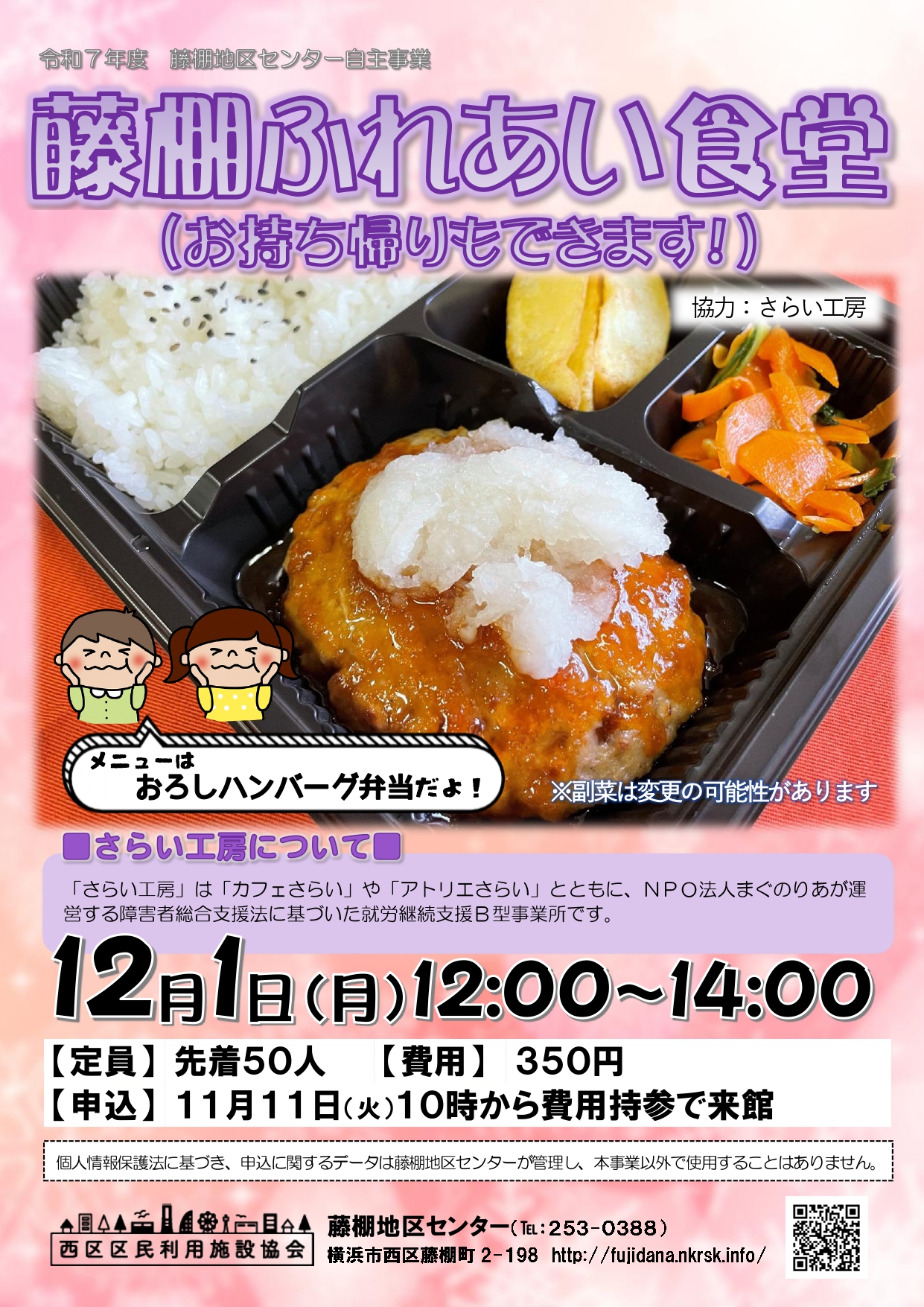 2025年10月07日 【12月1日(月曜日)開催】藤棚ふれあい食堂 開催日時 12月1日(月曜日)12時00分から14時00分まで 対象 どなたでも 定員 先着50人 費用 350円 申込方法 11月11日(火曜日)10時から費用持参で来館