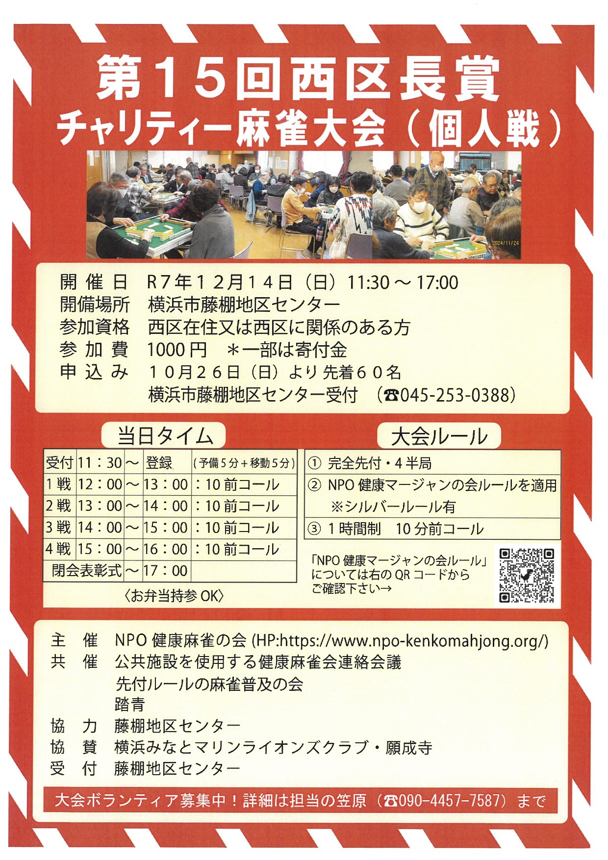 2025年10月07日 【12月14日(日曜日)】第15回西区長賞チャリティー麻雀大会 開催日時 12月14日(日曜日)11時30分から17時00分 対象 西区在住または西区に関係のある方 定員 先着60人 参加費 1,000円(一部は寄付金) 申込方法 10月26日(日曜日)から来館または電話で申込