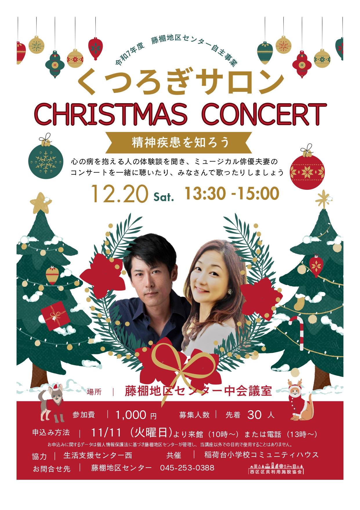 2025年11月07日 【12月20日(土曜日)開催】くつろぎサロン~クリスマスコンサート~ 心の病を抱える人の体験談を聞き、ミュージカル俳優夫妻のコンサートを一緒に聴いたり、みなさんで歌ったりしましょう。 開催日時 12月20日土曜日13時30分から15時00分 対象 どなたでも 定員 先着30人 参加費 ¥1,000 申込方法 11月11日火曜日10時から来館にて受付、または13時から電話で申込み