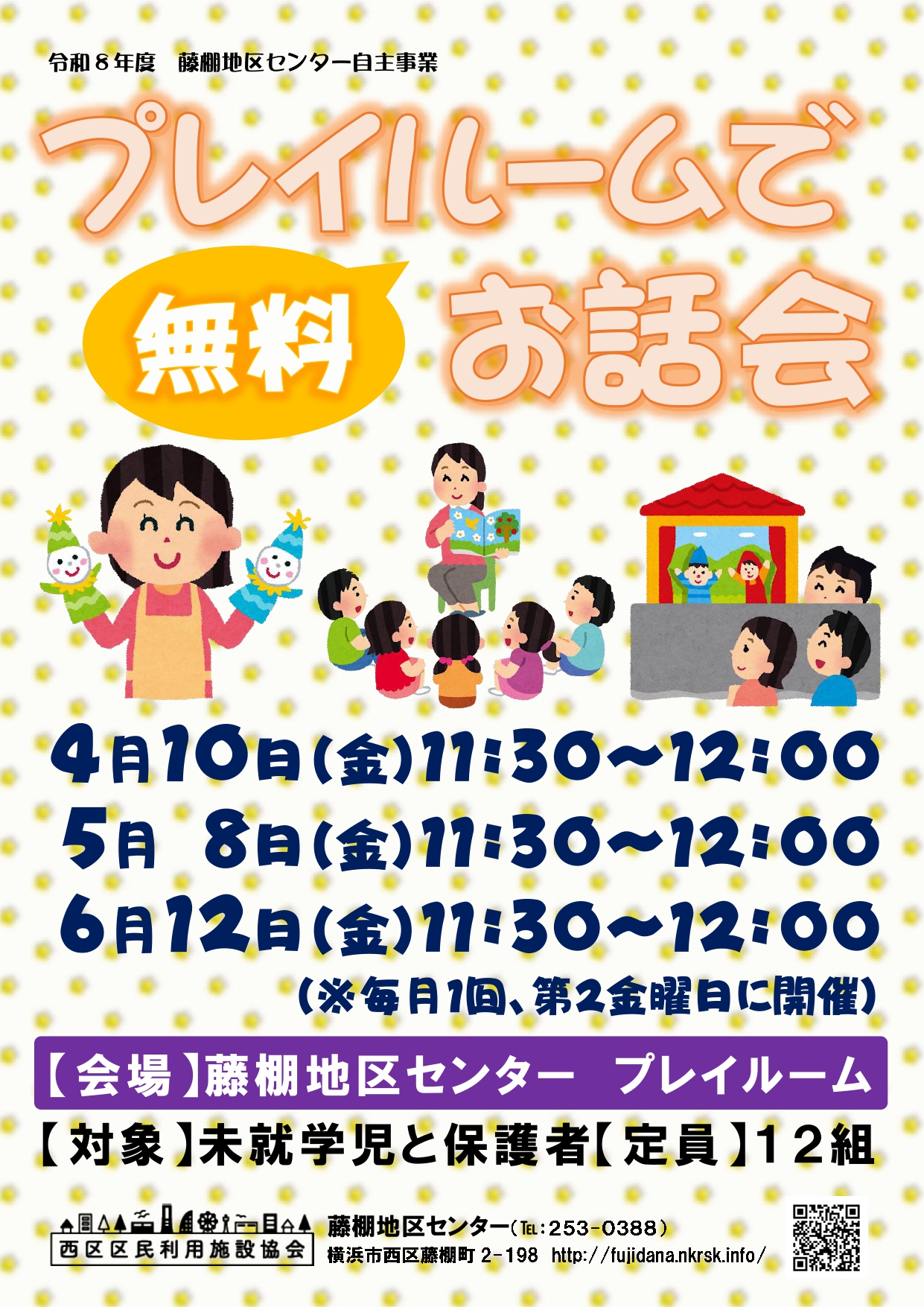 2026年03月13日 【4月10日、5月8日、6月12日(金曜日)開催】プレイルームでお話会 「ぽっぽっぽっ」のみなさんと、指人形やパネルシアター、お話でみんなで楽しい時間を過ごしましょう。 (お話会はじまるよは毎月第2金曜日にプレイルームで開催します) 開催日時 4月10日(金曜日)11時30分から12時 5月8日(金曜日)11時30分から12時 6月12日(金曜日)11時30分から12時 対象 未就学児と保護者 定員 先着12組 参加費 無料 申込方法 当日直接来館