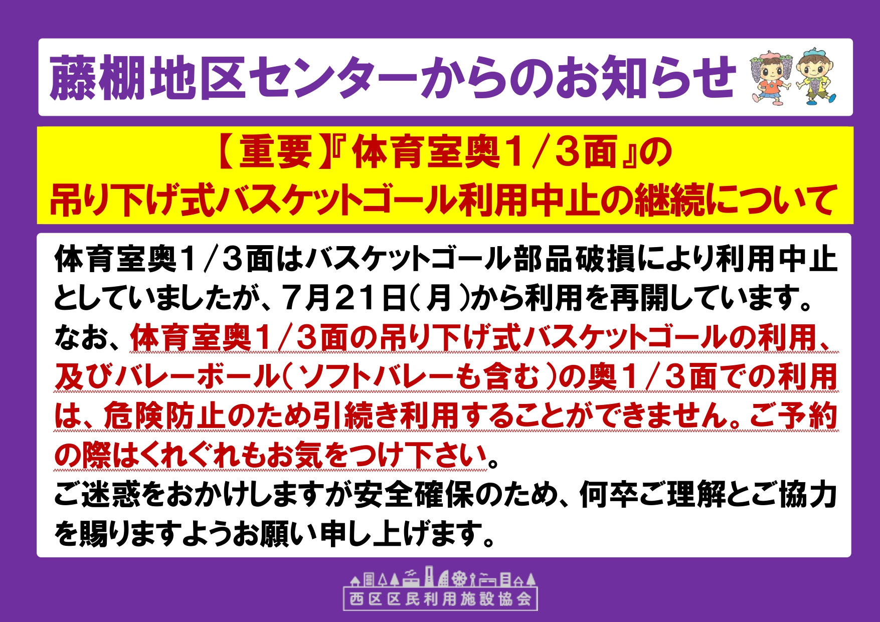 2025年09月19日 【再掲】『体育室奥1/3面』の吊り下げ式バスケットゴール利用中止の継続について 体育室奥1/3面はバスケットゴール部品破損により利用中止としていましたが、7月21日(月曜日)から利用を再開しています。 なお、体育室奥1/3面の吊り下げ式バスケットゴールの利用、及びバレーボール(ソフトバレーも含む)の奥1/3面での利用は、危険防止のため引続き利用することができません。ご予約の際はくれぐれもお気をつけ下さい。 ご迷惑をおかけしますが安全確保のため、何卒ご理解とご協力を賜りますようお願い申し上げます。