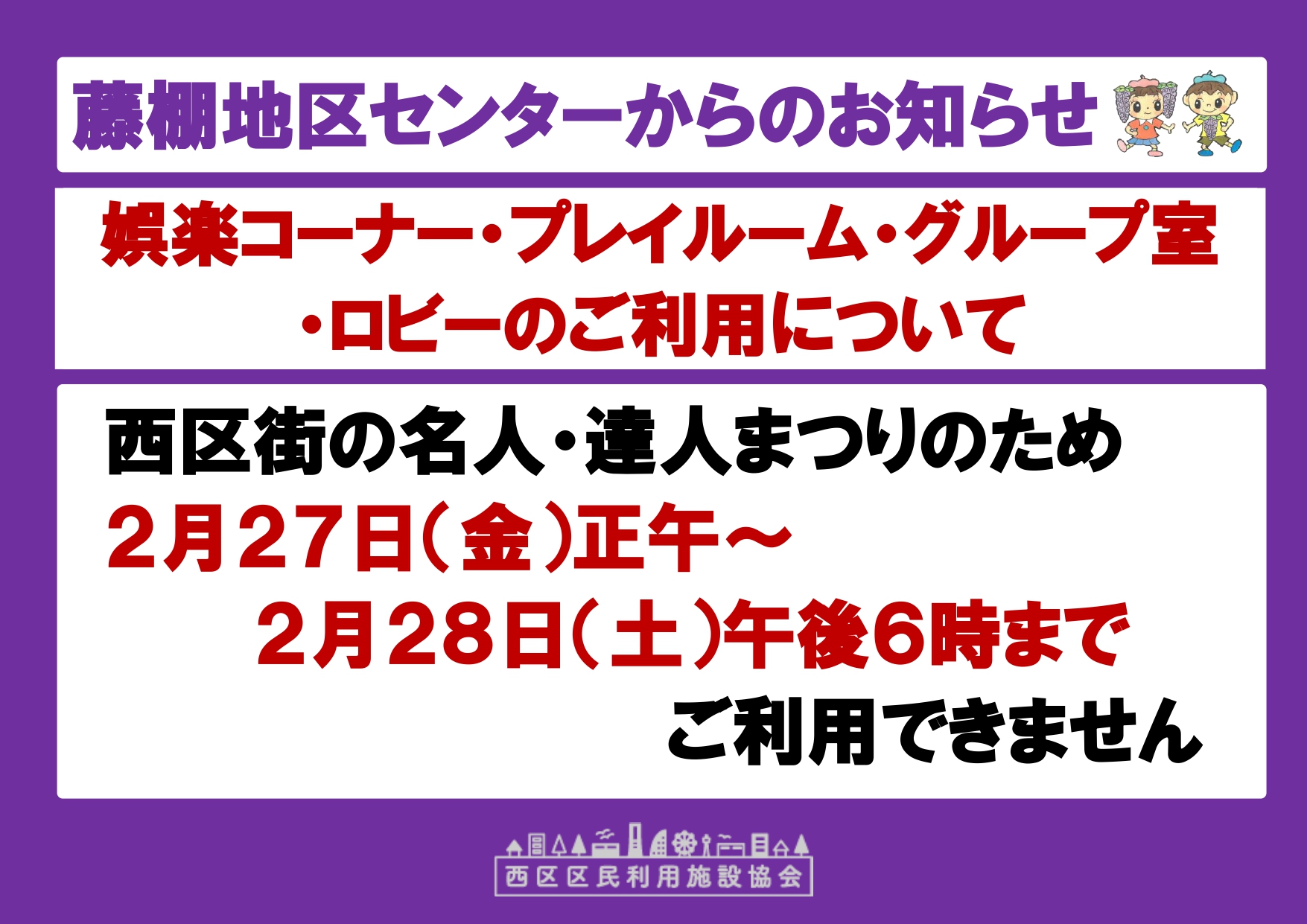 2026年02月22日 【西区街の名人・達人まつり】フリースペースのご利用について 2月28日(土曜日)は西区街の名人・達人まつりのため 2月27日(金曜日)正午から2月28日(土曜日)午後6時まで 娯楽コーナー・プレイルーム・グループ室 ・ロビーはご利用できません 予めご了承下さい
