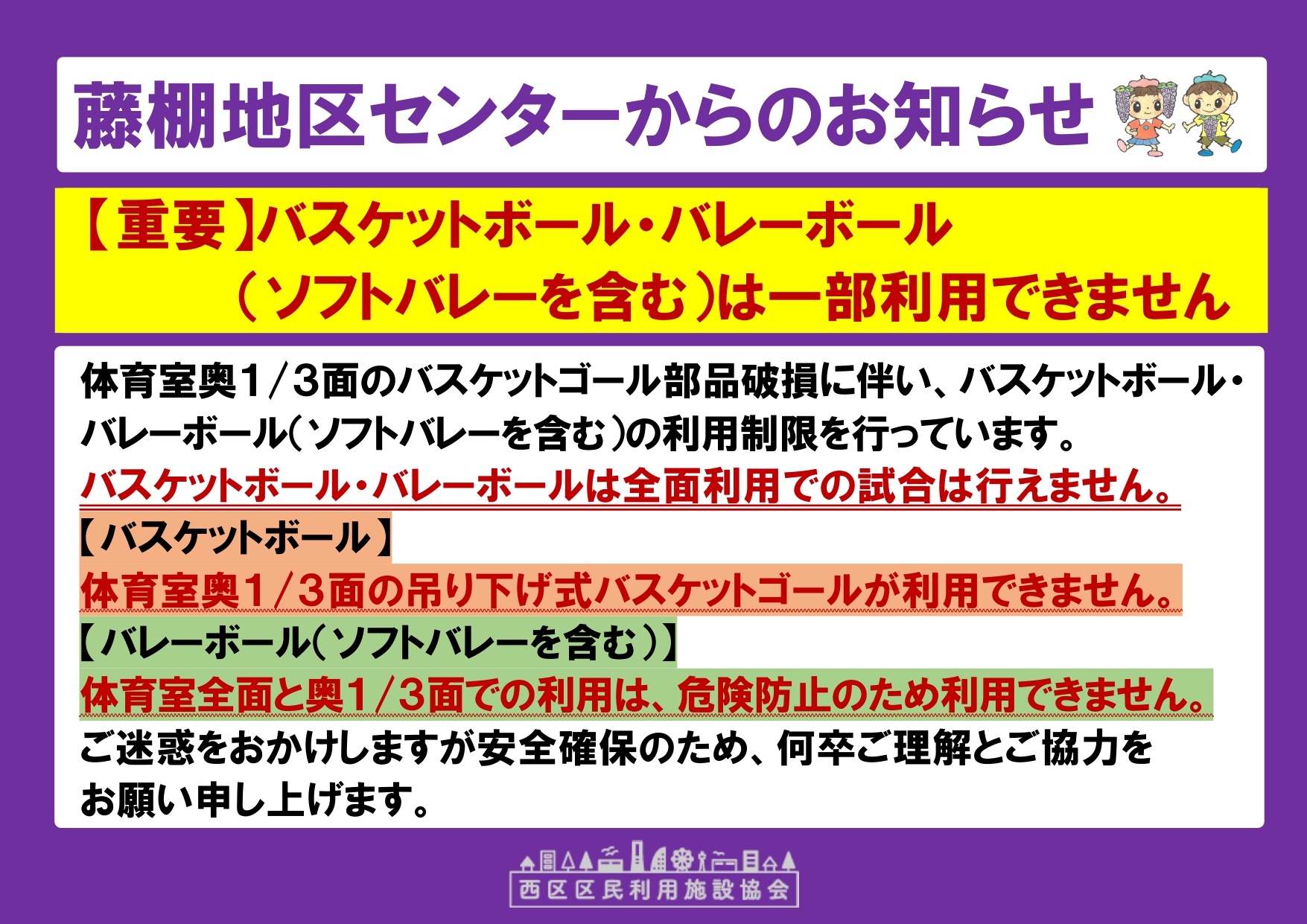 体育室奥1/3面のバスケットゴール部品破損に伴い、バスケットボール・バレーボール(ソフトバレーを含む)の利用制限を行っています。
