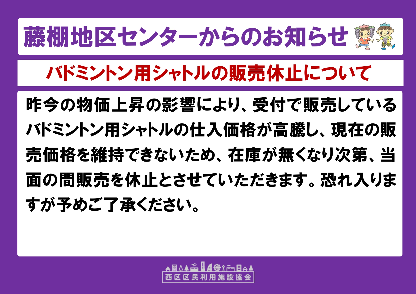 2026年03月19日 バドミントン用シャトルの販売休止について 昨今の物価上昇の影響により、受付で販売しているバドミントン用シャトルの仕入価格が高騰し、現在の販売価格を維持できないため、在庫が無くなり次第、当面の間販売を休止とさせていただきます。恐れ入りますが予めご了承ください。