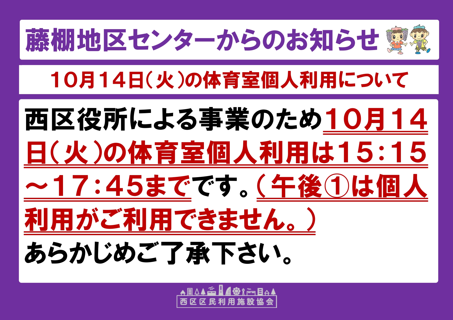 2025年09月19日 10月14日(火曜日)の体育室個人利用について 藤棚地区センターをご利用頂きありがとうございます。 西区役所による事業を行うため10月14日(火曜日)の体育室個人利用は15:15から17:45までです。 (午後(1)は個人利用がご利用できません。) あらかじめご了承下さい。